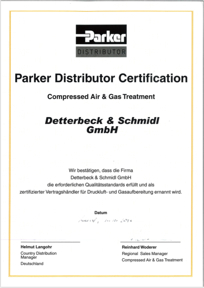 Die Firma Parker zertifiziert D&S GmbH zum Stützpunkthändler für Druckluft und Gasaufbereitung.